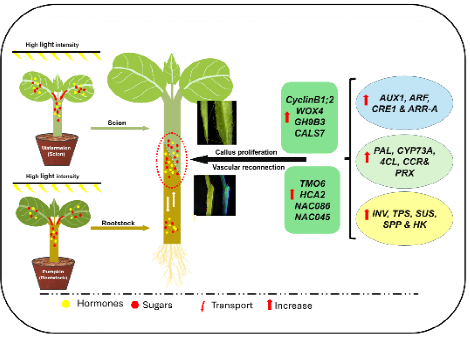 基于此,研究团队提出一种光强调控嫁接愈合的分子模型:高光强通过促进砧木与接穗中激素和糖类的转运与积累,激活激素信号通路(AUX1、ARF、CRE1)、苯丙烷生物合成关键酶(PAL、CYP73A、4CL)以及糖代谢相关基因(INV、SUS、HK),共同驱动愈伤组织增殖、细胞壁重建和维管组织早期分化与重连,最终实现无子叶嫁接的高效愈合。