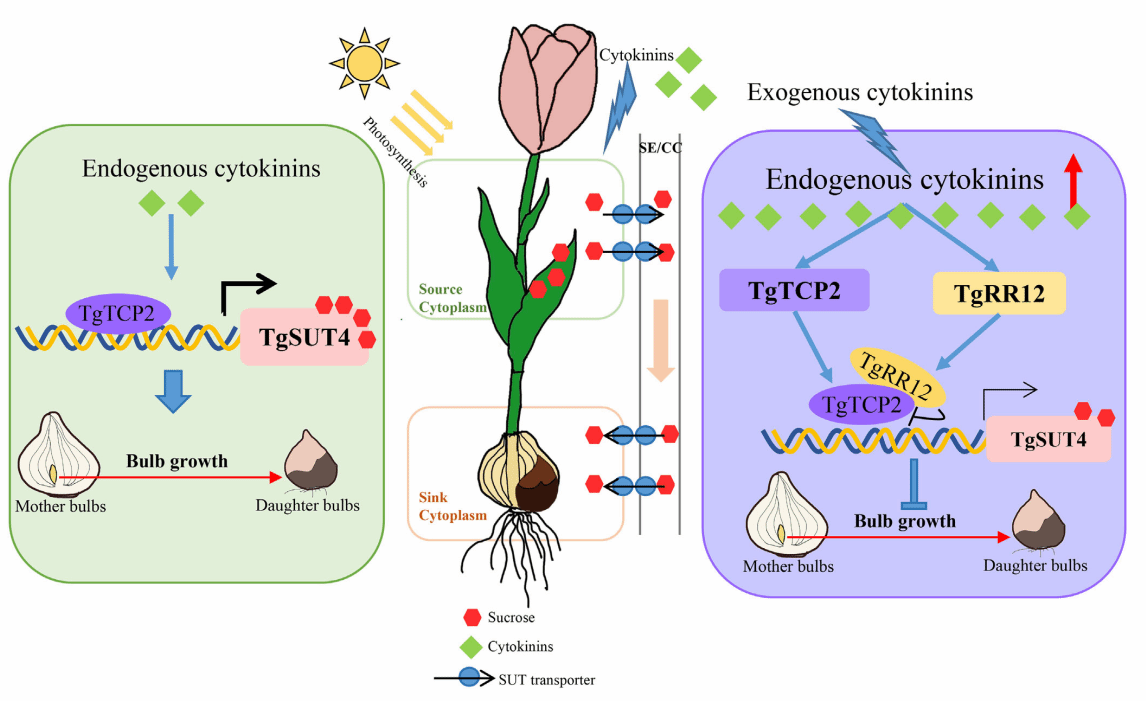 本研究基于郁金香鳞茎发育过程的比较转录组分析,筛选到TgTCP2转录因子,进一步研究发现在低浓度细胞分裂素条件下,该基因可直接激活TgSUT4的转录并促进糖的合成及向子球的运输;而当外源细胞分裂素浓度较高时,则激活Type-B转录因子TgRR12与TgTCP2的相互作用,进而负向调节糖的合成与运输。这一发现系统揭示了植物激素与糖代谢协同调控球根花卉鳞茎类储藏器官形成的动态机制,也为未来利用过基因工程手段改良郁金香等球根作物的无性繁殖效率提供了理论依据和潜在靶点。