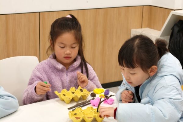 在对春分节气有了充分了解后,活动迎来了孩子们最喜爱的手工创作环节——春日黏土盆栽制作。志愿者与社区工作人员相互配合,为孩子们讲解制作步骤、提供贴心指导。孩子们手持鸡蛋托与各色黏土,尽情发挥想象力与创造力:先取棕色黏土铺入鸡蛋托做泥土,再铺一层绿色黏土做点缀的小草,最后用黏土捏制花叶,借助树枝串成花树模样。在孩子们的奇思妙想中,一件件独一无二、充满春日气息的黏土盆栽在孩子们的巧手中诞生。